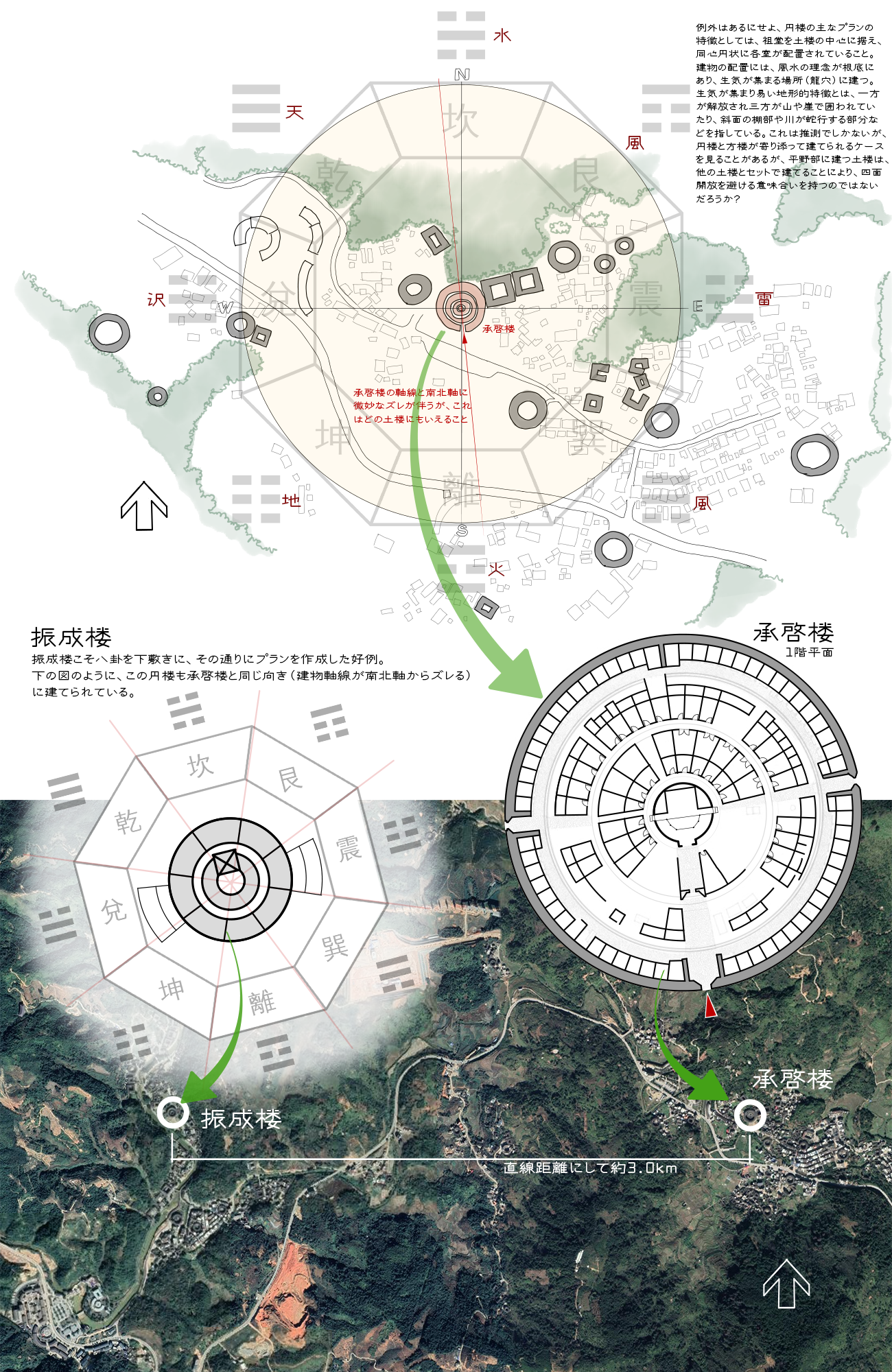 生気が集まり易い地形的特徴とは、一方が解放され三方が山や崖で囲われていたり、斜面の棚部や川が蛇行する部分などを指す。これは推測でしかないが、円楼と方楼が寄り添って建てられるケースを見ることがあるが、平野部に建つ土楼は、他の土楼とセットで建てることにより、四面開放を避ける意味合いを持つのではないだろうか?