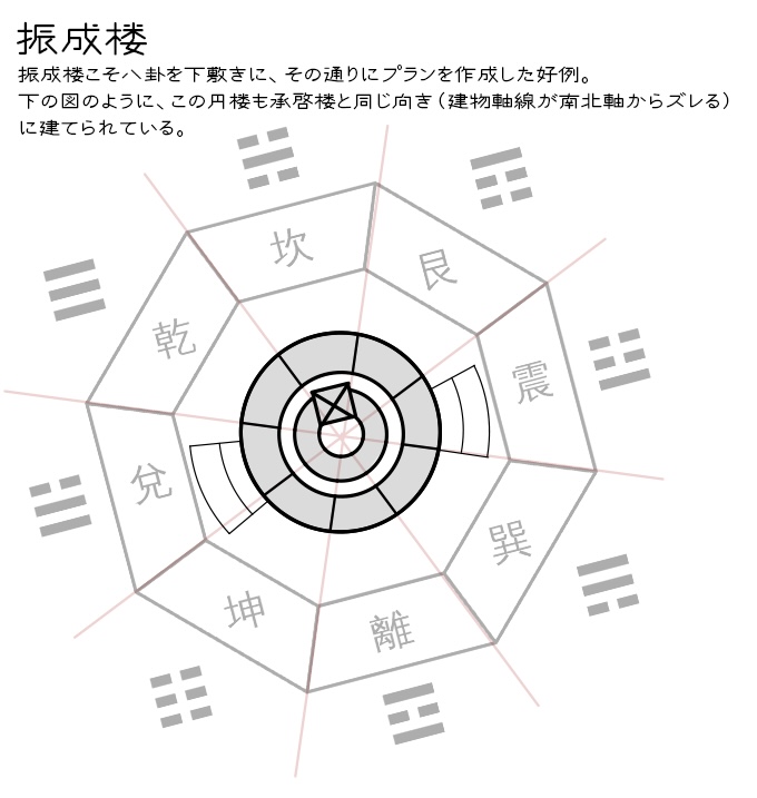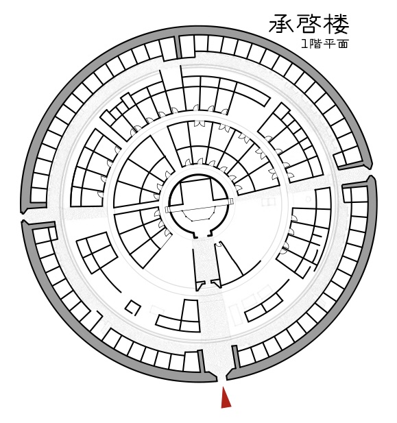 円楼のプランの特徴としては、主に2つあり、ここに掲載する承啓楼と振成楼は、土楼の王道と言わしめる存在で、祖堂を土楼の中心に据え、同心円状に各室を配置する。それら個々の室に至る共用廊下(走馬廊)を内部に巡らす形式の「内通廊式土楼」である。 一方で、共用廊下を有せず単独の階段で完結する形式の「単元式土楼」(いわゆる公団住宅のような形式)