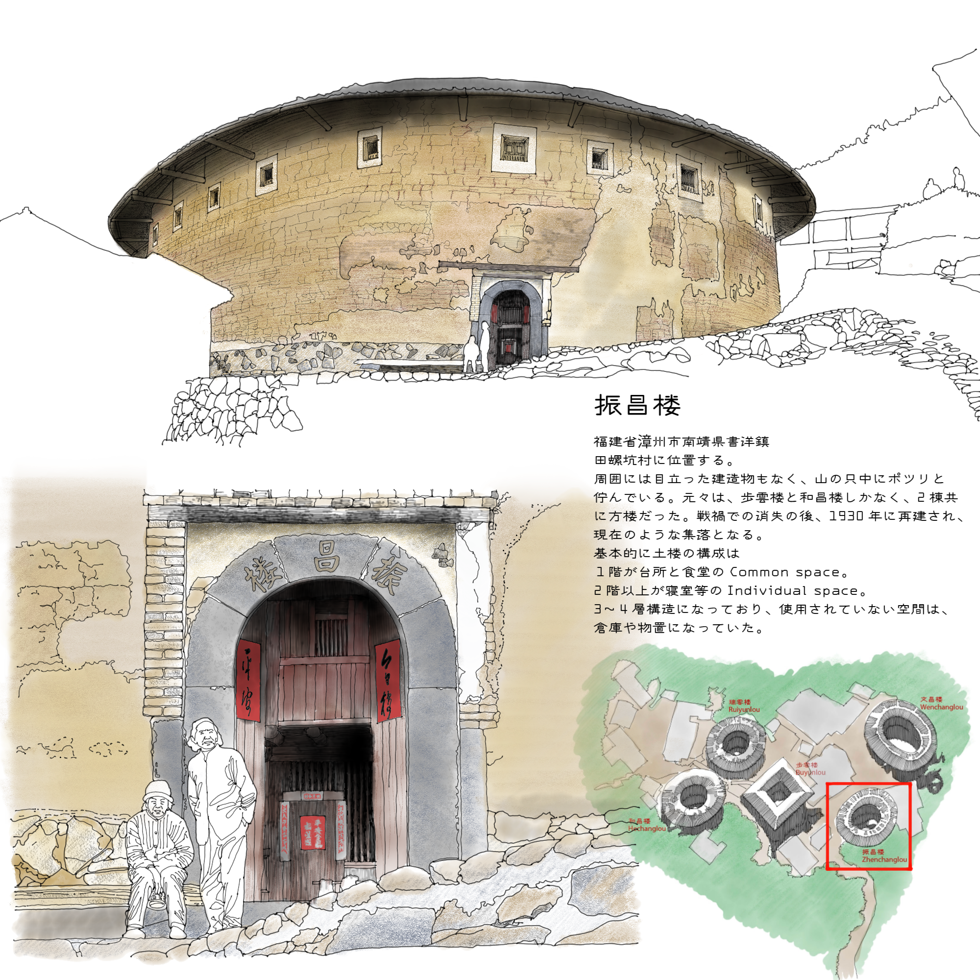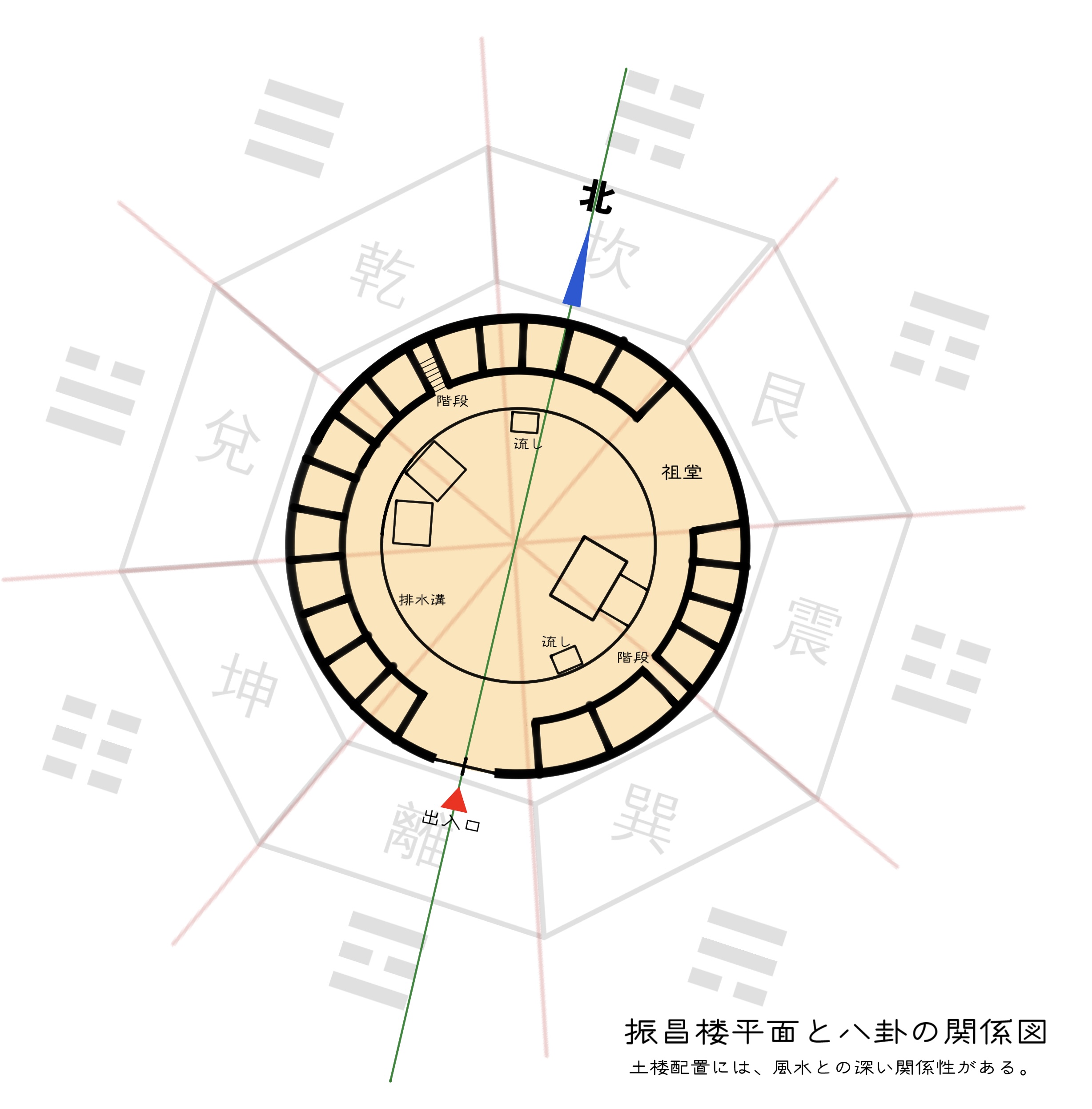 各階に26室配列。土楼の室用途の基本構成は1階が台所と食堂で、2階以上が寝室等の個室。風水によって配置が定められ、1か所しかない出入口は基本的に南側。